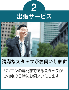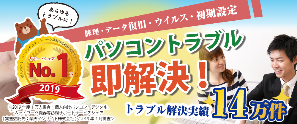 電話がつながらない。パソコンに詳しくないので電話で問い合わせるのに気が引ける…。そんな経験ありませんか?「パソコン修理屋くまさん」では年間14万件以上のサポート実績があるため、3コール以上お待たせしたり、専門用語などのむずかしい言葉を使ったサポートは一切いたしません。日本全国どこへでも、電話1本ですぐに駆けつけ解決いたします。